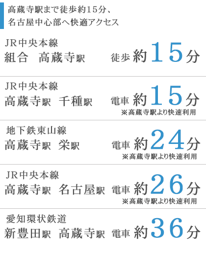 ショッピング施設や飲食店などが集まり、利便性が日々向上する街並みは、 都心部へのアクセスも千種駅まで快速で約15分、高蔵寺駅まで徒歩約15分 拡張された道路、綺麗な街並み、名古屋の新しいベッドタウンです。